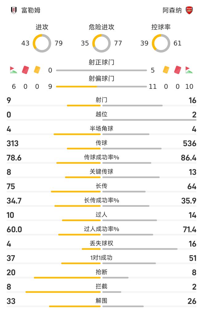 射門次數(shù)方面,阿森納全場16次射門5次射正且攻入1球,富勒姆全場9次射門但射正數(shù)掛零。